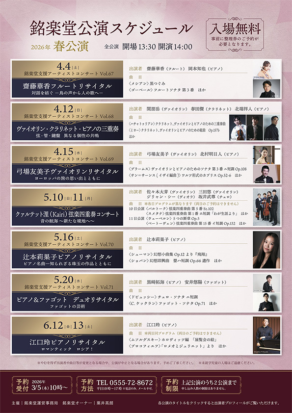 富士の麓で芸術文化を振興し、クラシック音楽の素晴らしさを普及させたいという、粟井英朗氏(富士山GXホールディングス株式会社代表取締役社長)の強い想いと信念から、最高級ピアノサロン銘楽堂が造られました。銘楽堂はコンサートサロンであるだけでなく、音楽教室を兼ね備えた教育機関であり、銘楽堂運営事務局は音楽を通じた芸術事業普及活動にも取り組みます。