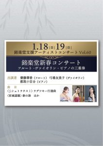 出演は銘楽堂支援アーティストの齋藤華香さん(Fl)、弓場友美子さん(Vn)、都筑小百合さん(Pf)。